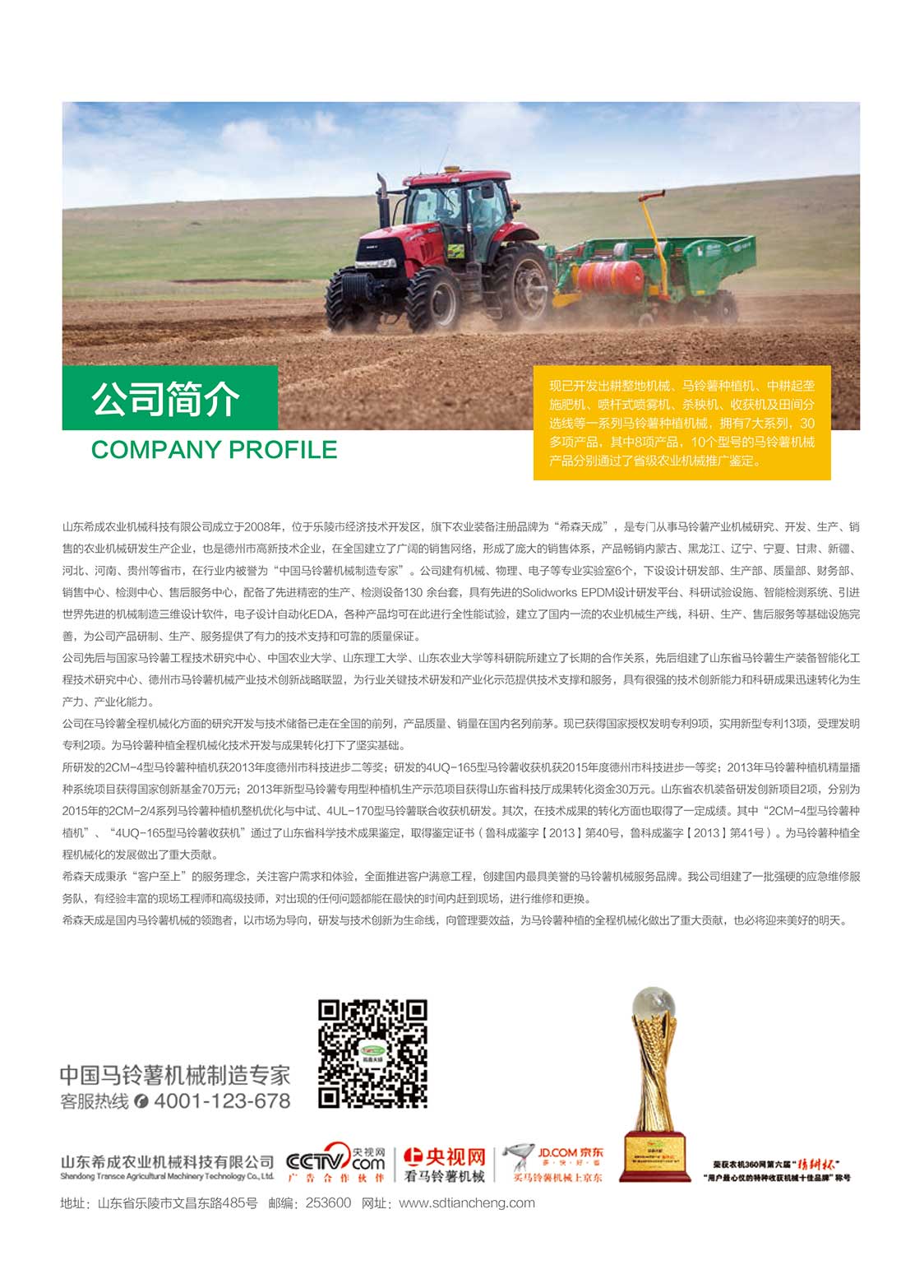 山东希成农业机械科技有限公司位于乐陵市经济技术开发区云红北大街北首, 成立于2008年,是专门从事马铃薯产业机械研究、开发、生产、销售的农业机械研发生产企业,在全国建立了广阔的销售网络,形成了庞大的销售体系,产品畅销国内马铃薯主产区,并畅销国外多个马铃薯主产国。