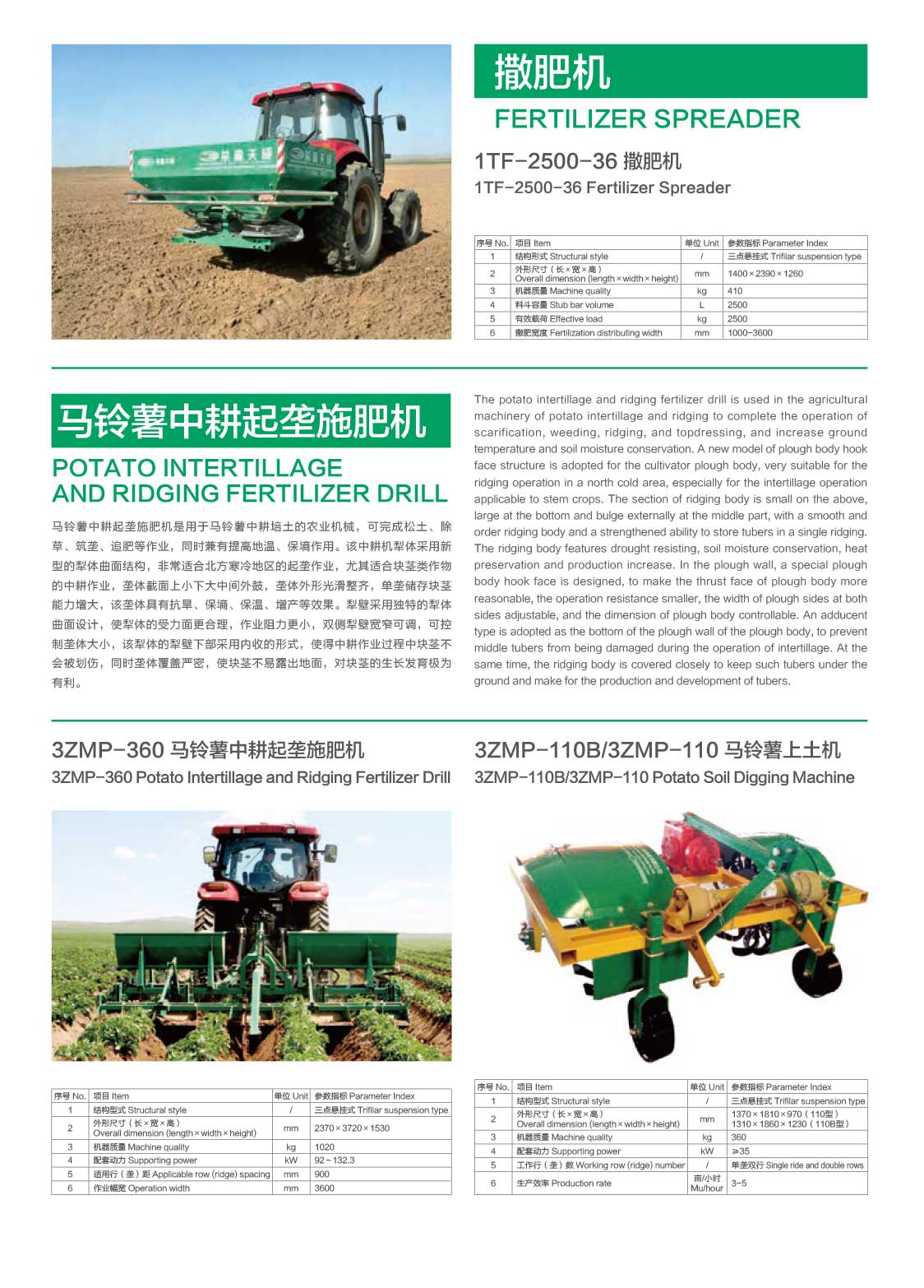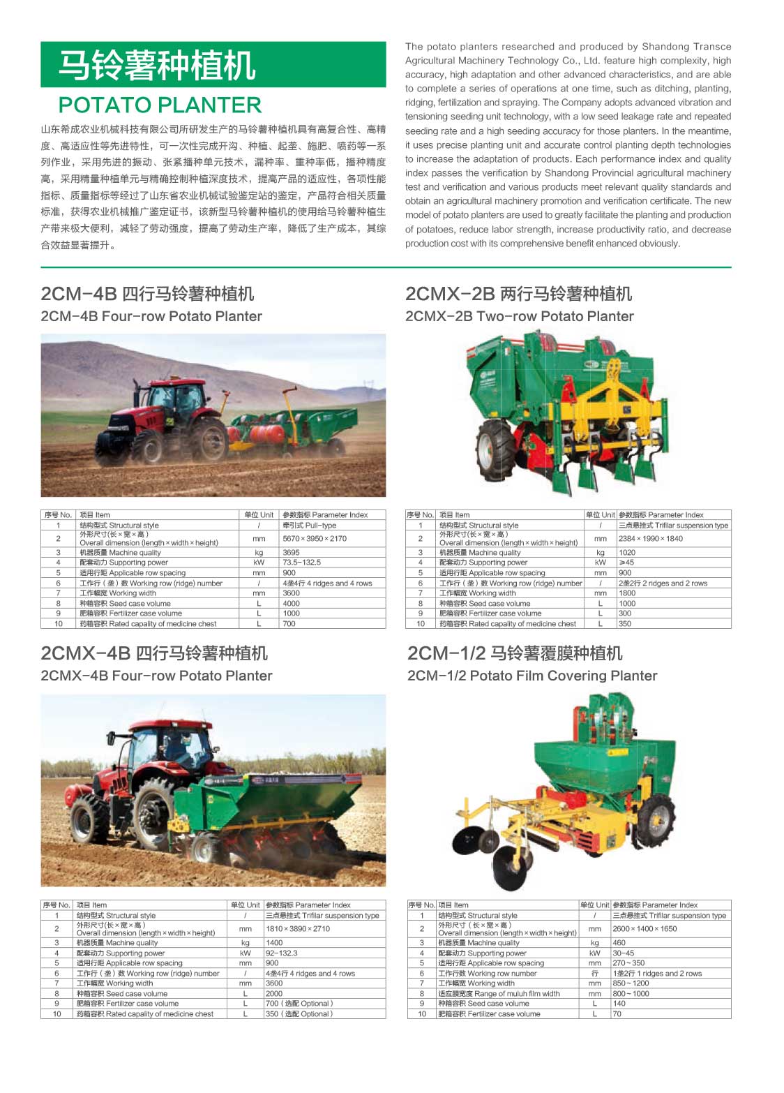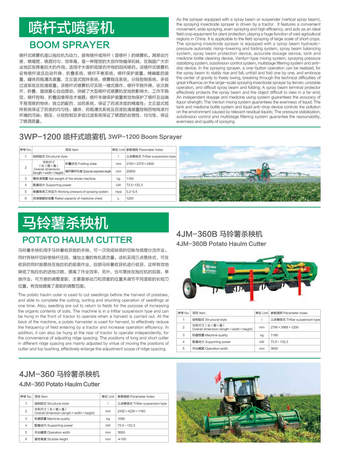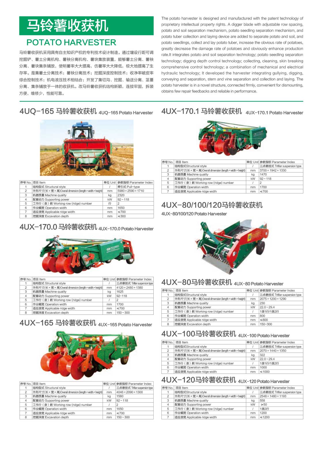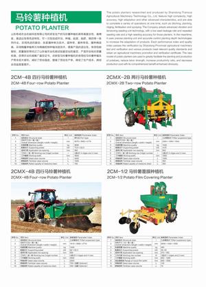 公司现已开发出耕整机机械、马铃薯种植机、中耕起垄施肥机、喷杆式喷药机、杀秧机、收获机及输送清选机等一系列马铃薯种植机械,拥有7大系列,30多项产品。